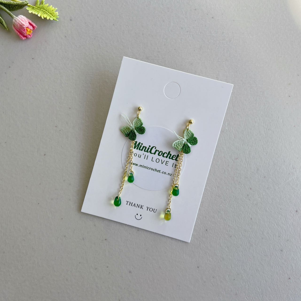 Each earring showcases a meticulously hand-crocheted butterfly, crafted with precision to capture the beauty and grace of these delicate creatures. Accented with small, shimmering beads, these earrings offer a unique and charming accessory that adds a touch of whimsy to any outfit.