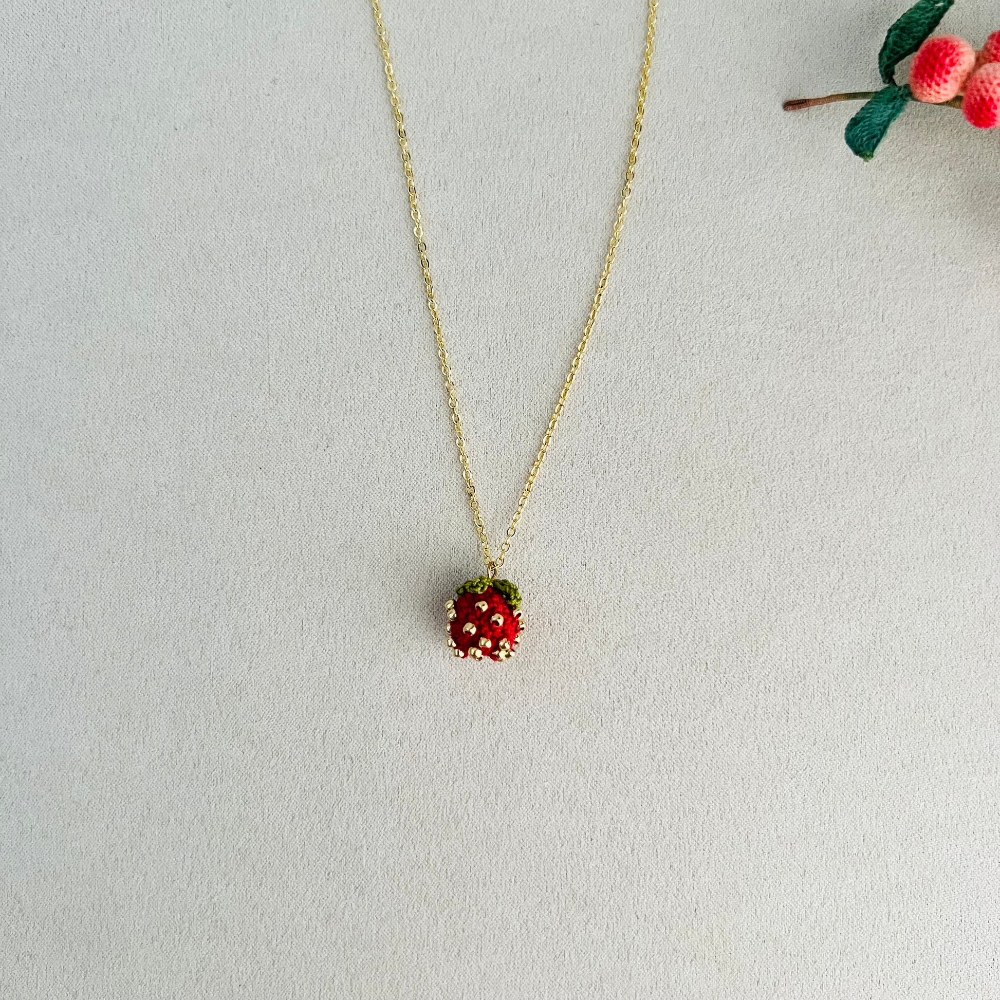 - This handmade strawberry necklace is lightweight and very easy to wear.